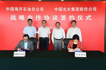 6月1日,中国海洋石油总公司(下称中国海油)与中国光大集团股份公司(下称光大集团)在京签署战略合作协议。双方表示将共同落实国家“一带一路”战略,进一步深化产融合作,协手开拓国际市场。在中国海油党组书记、董事长杨华,光大集团党委书记、董事长唐双宁以及中国海油党组成员、副总经理袁光宇,光大集团党委委员、执行董事、光大银行行长张金良的见证下,中国海油党组成员、总会计师温冬芬和光大集团党委委员、副总经理吴富林代表双方在协议书上签字。