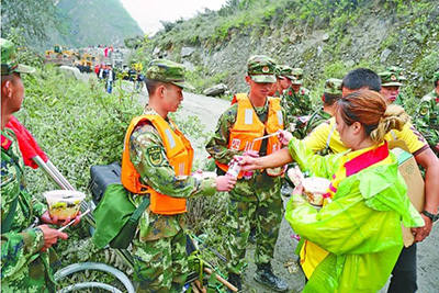 距灾害发生仅两小时,岷江分公司土门加油站员工自发组成的中国石油志愿者小队,就带着矿泉水、面包、方便面等物资到达抢险救灾现场。11时,第一辆装载10吨柴油和1吨汽油的小额配送车到达救灾现场,比大型机械还提前到达。14时左右,小额配送车陆续为现场抢险救灾车辆加注油品,保障油品供应。22时,又一辆装载16吨柴油的小额配送车到达现场。岷江分公司现场救援小组连夜奋战,不眠不休,确保每一辆车辆和机械正常运转。除保障油品供应外,中国石油青年志愿者还协助消防官兵救人,为一线参与现场抢险救援的消防、武警、公安、医务等救援人员提供矿泉水、面包、方便面等补给。