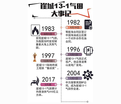崖城13-1气田位于海南岛西南91公里、香港西南700多公里海域。为履行协议、高效开发气田实现共赢,中国海油与合作方按国际最新技术标准施工,使该项目达到国际水平。特别是崖城至香港的778公里输气管道,总长度世界第二,管输压力世界第一。1996年1月气田成功投产,年产气34亿立方米,其中29亿立方米送往香港,可发电量占香港总发电量的25%以上,开始为香港的经济社会发展提供清洁能源保障。由此,香港的能源供应能力提升,气田也实现为国创汇。