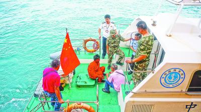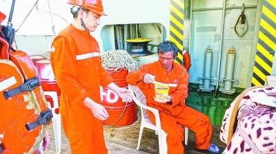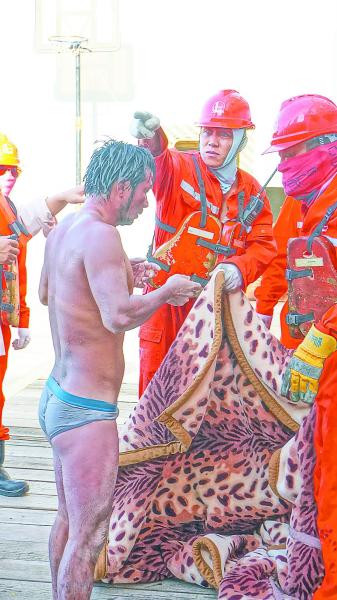 图1:将落水人员交给中国海事部门。图2:勘探队员给落水人员扔下救生圈。图3:勘探队员给落水人员拿出厚厚的毛毯取暖。图4:落水人员上岸后吃上热乎乎的方便面。