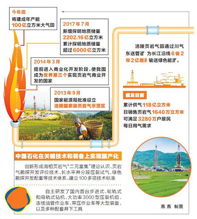 在勘探过程中,中国石化在关键技术和装备上实现国产化。创新形成海相页岩气“二元富集”理论认识、页岩气勘探开发评价技术、长水平井分段压裂试气、绿色勘探开发配套等技术体系,建立100多项技术标准,为我国页岩气大规模有效开发提供了可借鉴经验。自主研发了国内首台步进式、轮轨式和导轨式钻机、大功率3000型压裂机组、连续油管作业车、带压作业车等大型装备,以及多种配套井下工具,大批量投入现场应用,打破国外垄断,开国内页岩气开发先河。