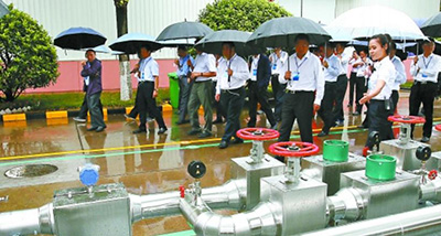 ①与会代表冒雨参观长庆油田石油机械制造总厂一大批具有自主知识产权、行业领先的重要产品。