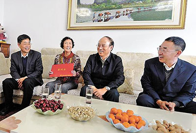 2月7日,戴厚良来到全国劳动模范代旭升(右一)家中,看望代旭升及夫人吴晓萍。