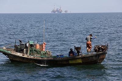 2017年9月1日,禁渔期结束后的第一天,赶海的渔民像约定好了一样直奔海上油区。近年打渔经验告诉他们,海上油区零排放,鱼儿都愿意往那里扎堆。杜鹏辉 摄