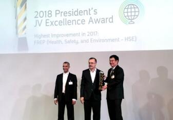 4月30日,沙特达兰,沙特阿美公司总裁卓越运行奖颁奖典礼隆重举行,福建联合石化荣获卓越运行奖——2017年HSE表现最佳进步奖。这是福建联合石化公司自2007年成立以来首次获得该奖项,代表了沙特阿美对福建联合石化2017年度的生产经营业绩,特别是HSE优秀表现的充分肯定。