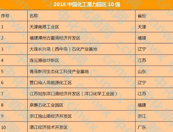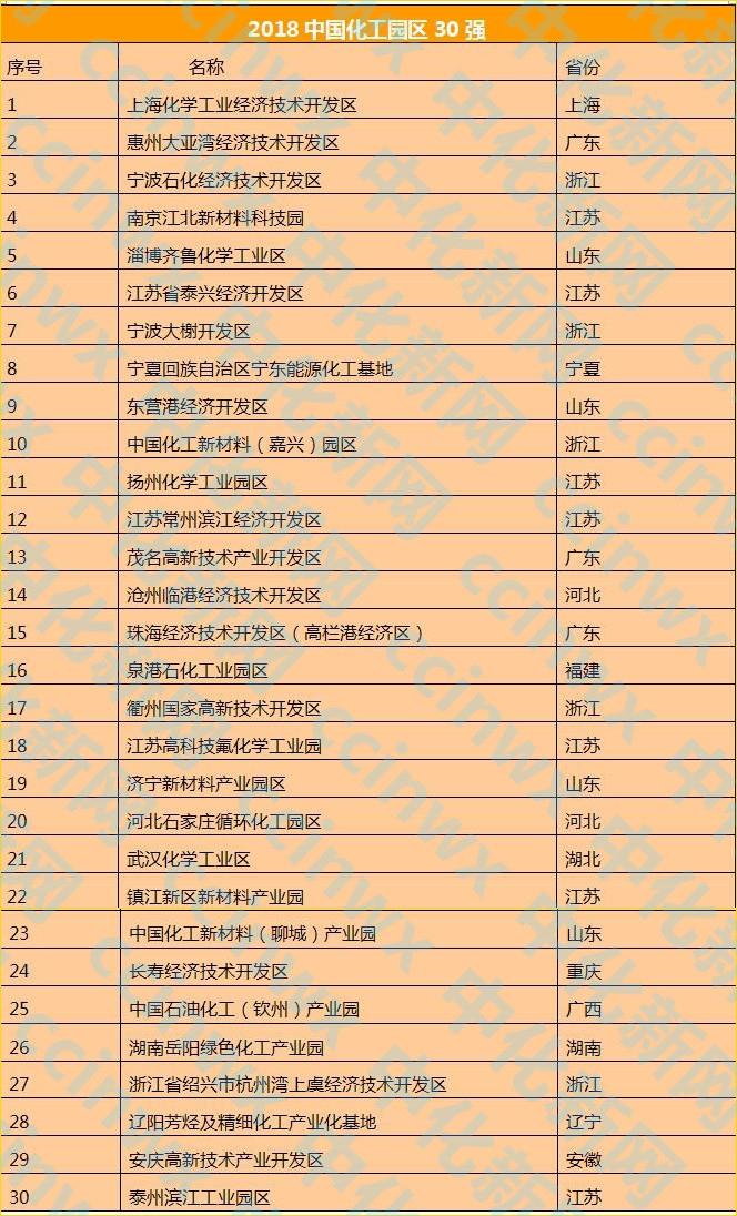上海化学工业经济技术开发区、惠州大亚湾经济技术开发区、宁波石化经济技术开发区、南京江北新材料科技园、淄博齐鲁化学工业区、江苏省泰兴经济开发区、宁波大榭开发区、宁夏回族自治区宁东能源化工基地、东营港经济开发区、中国化工新材料(嘉兴)园区等园区荣登2018中国化工园区30强。