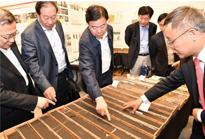 王宜林在加拿大卡尔加里调研期间,查看岩芯资料,了解油砂项目进展。