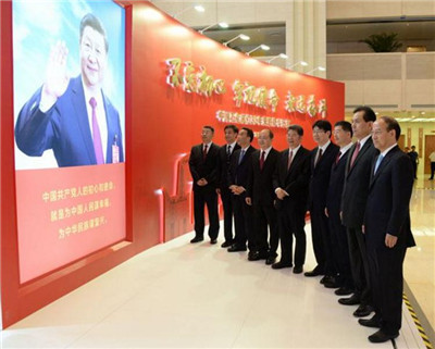 图为集团公司领导参观《不忘初心牢记使命永远奋斗——中国石化成立35年来的奋斗历程》展览。