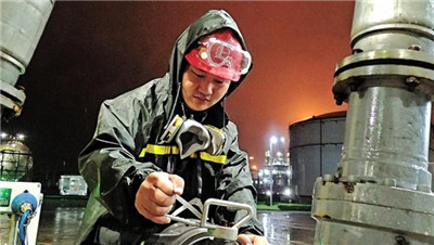 9月16日,茂名石化员工冒雨检查设备运行情况。郑伟鹏 摄