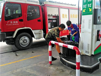 9月16日,广东中山石油爱国加油站员工为抢险消防车辆提供保障用油。田花 摄