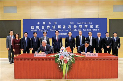 中国石化集团公司副总经理凌逸群、SK创新株式会社社长金俊代表双方签署战略合作谅解备忘录。