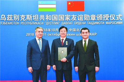 乌兹别克斯坦国家友谊勋章颁授仪式10月11日在北京中国石油大厦举行。受乌兹别克斯坦总统米尔济约耶夫委托,乌兹别克斯坦驻华大使赛义多夫、乌兹别克斯坦国家油气公司管委会主席阿什拉夫汉诺夫向中国石油集团董事长王宜林颁发了乌兹别克斯坦国家友谊勋章和证书,以表彰其对乌兹别克斯坦经济社会发展做出的重要贡献。赛义多夫在致辞中说,在习近平主席和米尔济约耶夫总统的推动下,乌中两国合作不断取得重大成就和新成果,这不仅得益于古老的丝绸之路,也得益于习近平主席提出的“一带一路”倡议。在这个倡议下,中国与许多国家发展友好关系,乌兹别克斯坦是这个倡议下的合作者,也体现在与中国石油开展的大规模油气合作之中。米尔济约耶夫总统日前签署命令,授予王宜林董事长乌兹别克斯坦国家友谊勋章。我很高兴今天被赋予这项重要使命,代表总统向您颁发乌兹别克斯坦国家友谊勋章,感谢您为乌中关系发展做出的重要贡献。