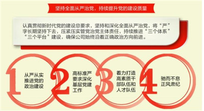 集团公司2019年工作会议上,党建成绩单格外亮眼:基层党组织的组织力和战斗力明显提升;一批忠诚事业、担当作为的领导人员和年轻干部得到提拔重用;风清气正的良好政治生态进一步巩固;集团公司形象建设成果显著,获得2018年度责任企业称号……这些新气象,是集团公司党组认真落实新时代党的建设总要求,坚持并深化全面从严治党取得的。