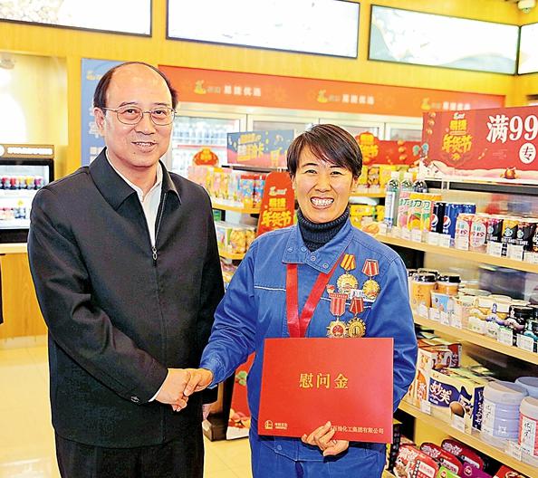 1月29日,戴厚良亲切看望慰问全国劳动模范、北京石油昊良加油站站长张松梅。