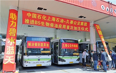 2018年5月,上海石油启动B5生物柴油调和设施建设项目,在闵行油库新建调和基地,形成完整的生物柴油调和系统,达到年发货40万~60万吨B5生物柴油的规模。截至4月底,上海石油已在247座加油站布点销售B5生物柴油。此次B5生物柴油进入公交系统,标志着全国首例餐厨废弃油脂制生物柴油进入成品油终端销售市场已形成规模。