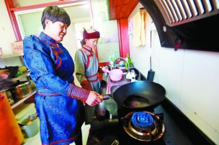 “天然气比灌装的煤气节约一半钱,一年200多元就够了。”近日,内蒙古鄂尔多斯市乌审旗图克镇蒙古族牧民吉仁太说。目前,华北油气分公司大牛地气田向陕西、内蒙古等地的8000余户农牧民供气,平均日供气3.3万立方米,满足了农牧民生活用气需求。图为吉仁太(左一)母子用天然气做饭。