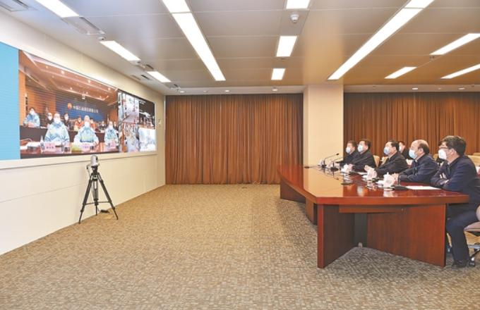 国资委主任郝鹏与湖北销售公司进行视频连线。记者 常正乐 摄