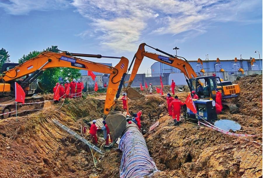 5月19日凌晨,新气管道与川气东送管道顺利完成连头施工。横跨东西和纵贯南北的两条主力输气管道,在湖北潜江实现连通,“川气南下”指日可待。新气管道与川气东送管道联络线总长3.4千米,该段工程建成,标志着潜江—郴州段管道具备接气条件。图为5月18日管道连通施工现场。