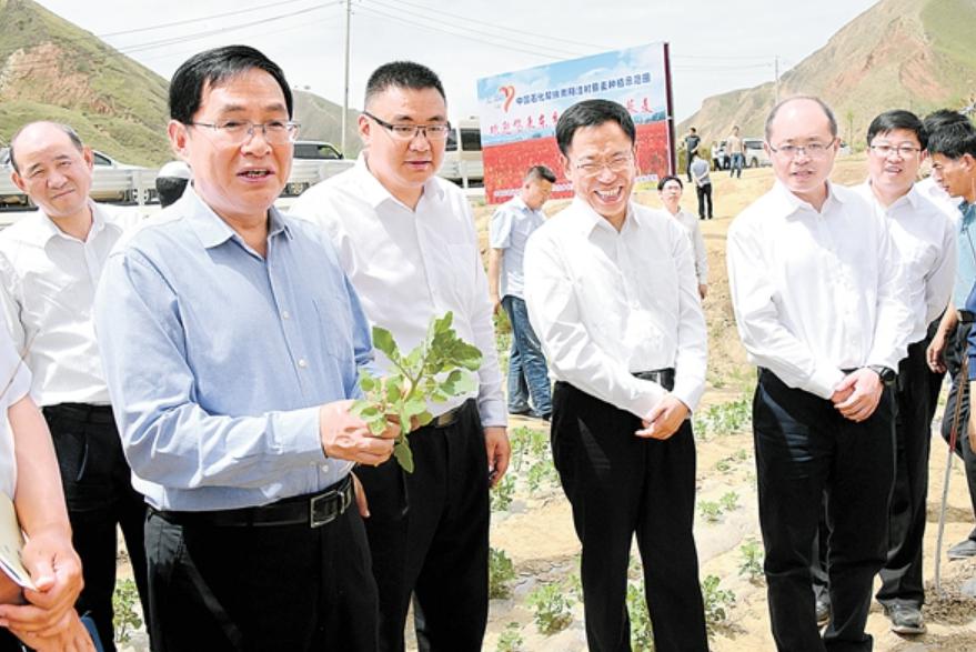 在南阳洼村藜麦种植示范地,张玉卓一行参加甘肃省农科院现场培训活动,与农科院专家和当地藜麦种植户交谈。张玉卓强调要发挥藜麦种植、收购、加工、销售全产业链优势,确保产业扶贫取得更好效果。
