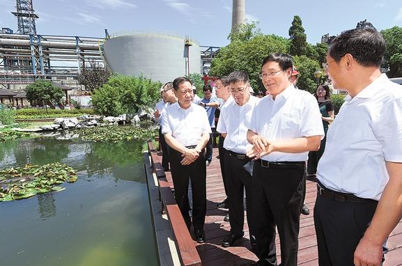 8月13日,张玉卓一行在九江石化水务部观察池旁了解水质情况。本报记者 程阳 汪光华 摄影报道