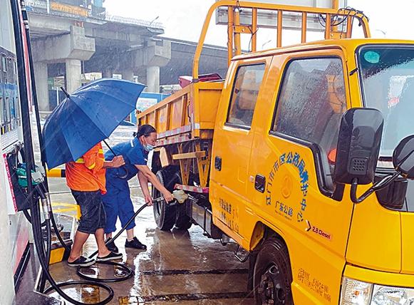 8月19日,广东江门石油兴南加油站员工在暴雨中为车辆加油。