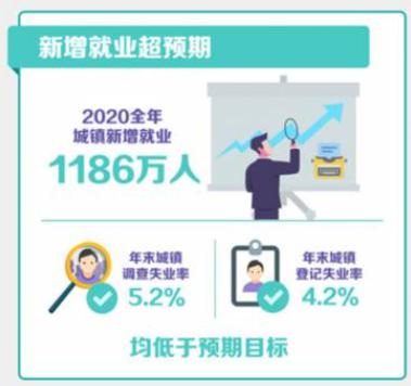 《公报》显示,去年全国城镇新增就业1186万人,比上年少增166万人。截至2020年年末,全国城镇调查失业率为5.2%,城镇登记失业率为4.2%,均低于预期目标。盛来运说,2020年保居民就业、保基本民生扎实有力,就业指标超额完成年初预期目标。