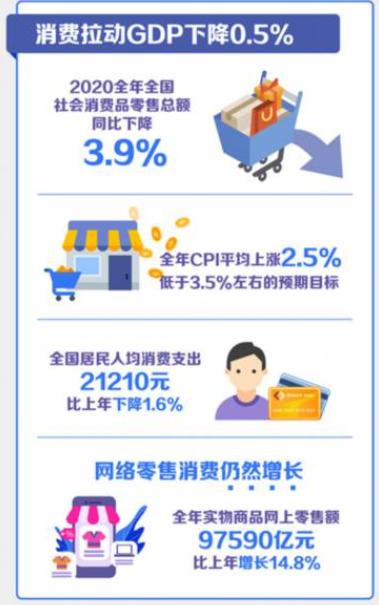 反映在个人消费支出上,2020年全国居民人均消费支出21210元,比上年下降1.6%,扣除价格因素,实际下降4.0%。其中,人均服务性消费支出9037元,比上年下降8.6%,占居民人均消费支出的比重为42.6%。在经济增长的“三驾马车”中,消费支出拉动GDP下降0.5个百分点,资本形成总额拉动增长2.2个百分点,货物和服务净出口拉动增长0.7个百分点。