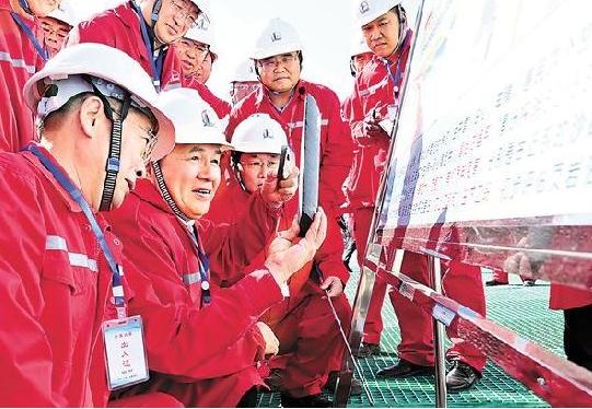 4月14日,张玉卓在胜利油田东胜公司樊页平1井调研,详细了解樊页平1井岩芯层状页岩沉积情况。