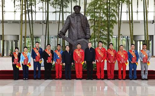 中国石油集团公司领导与“十大杰出青年”部分代表在铁人像前合影留念