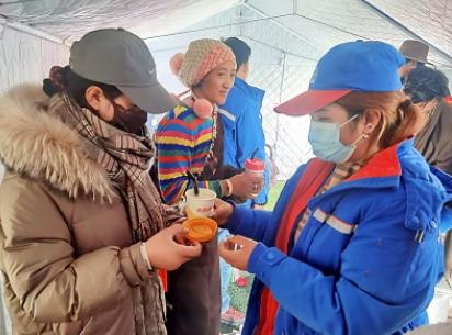 图2:5月22日,青海石油亚珠加油站员工为灾区安置点群众送上奶茶。