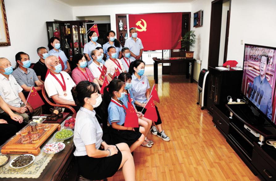7月1日,荣获“光荣在党50年”纪念章的孙家义、鹿金翠夫妇和社区党员服务社工作人员在胜利油田的家中观看庆祝中国共产党成立100周年大会直播。朱克民摄陈占青文
