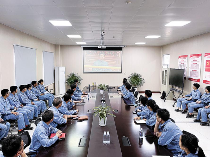 镇海基地项目管理部党员干部员工在建设现场的板房内,收看大会盛况。华赟摄