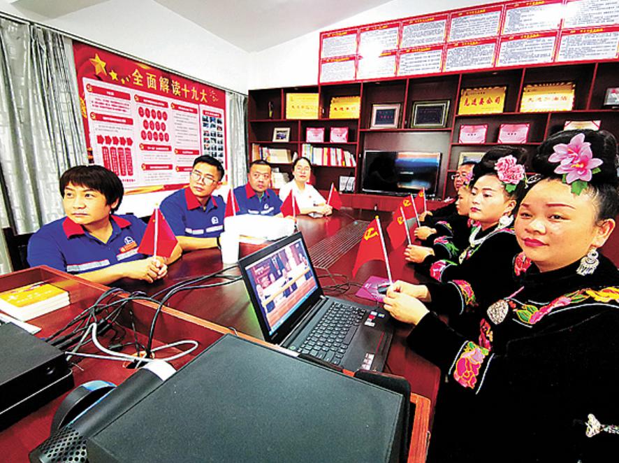 贵州黔东南石油雷山县公司员工身着苗族盛装观看大会直播。陈金瑞摄
