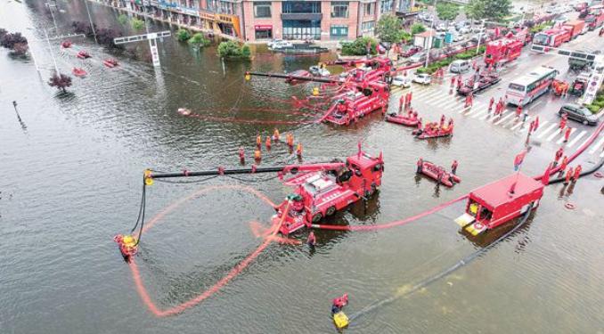一方有难八方支援。7月22日,胜利油田应急救援中心和胜大水利公司两支抢险救援队接到紧急指令,带上排涝设备奔赴郑州。11台潜水泵以3500立方米/时的流量向外抽水,截至7月27日早晨,累计排涝量达40万立方米。