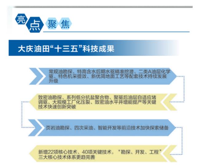 核心技术水平快速提升。围绕“勘探、开发、工程”三大核心技术领域,大庆油田丰富发展4项理论认识,创新形成22项核心技术,其中特高含水后期水驱高效精准挖潜技术、化学驱大幅度提高采收率技术持续处于世界领先水平,常规油精细勘探、致密油勘探开发一体化、断陷盆地油气勘探技术处于国内领先水平,陆相页岩油理论认识实现战略突破,大幅度降本工程配套技术处于国内领先水平。