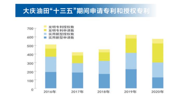 自主创新能力再上新高。大庆油田共获得上级科技成果奖励128项,其中2017年获国家科技进步二等奖和集团公司科技进步特等奖各1项、2020年获国家技术发明二等奖1项;申请专利1582件、授权专利1011件,获得中国优秀专利奖2项、集团优秀专利奖6项,集团公司认定自主创新重要产品13项;大庆油田优秀专利奖94项。