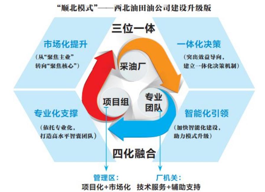 “顺北模式”则成为西北油田油公司建设的升级版。他们在采油厂层面组建专业化支撑团队,采油厂、支撑团队、承包商三支队伍突出优势,各尽其责,协同作战;同时,以市场化、一体化、专业化、智能化建设为抓手,支撑新型采油厂高效运转,形成“三位一体、四化融合”的油公司新模式。