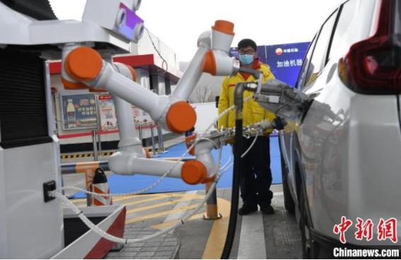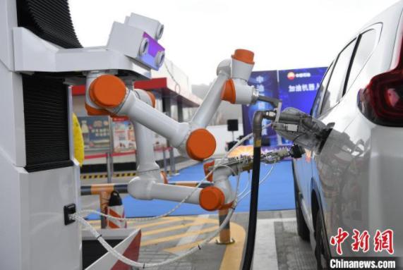 图为中国首个高原室外防爆加油机器人为车辆加油。