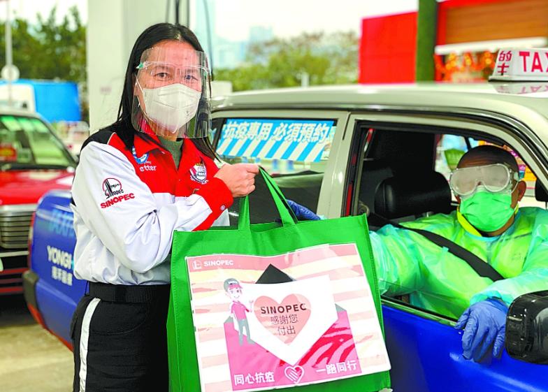 为助力香港抗疫工作,中石化(香港)有限公司准备了包括口罩、消毒湿巾、卓玛泉、饼干等物资的防疫慰问包,送至香港300辆抗疫的士和200辆抗疫中小巴司机手中。据悉,为解决救护车运力不足问题,香港日前特设抗疫的士和抗疫中小巴车队,专程接送确诊患者。图为2月25日,观塘专用气站员工为司机送上抗疫慰问包。