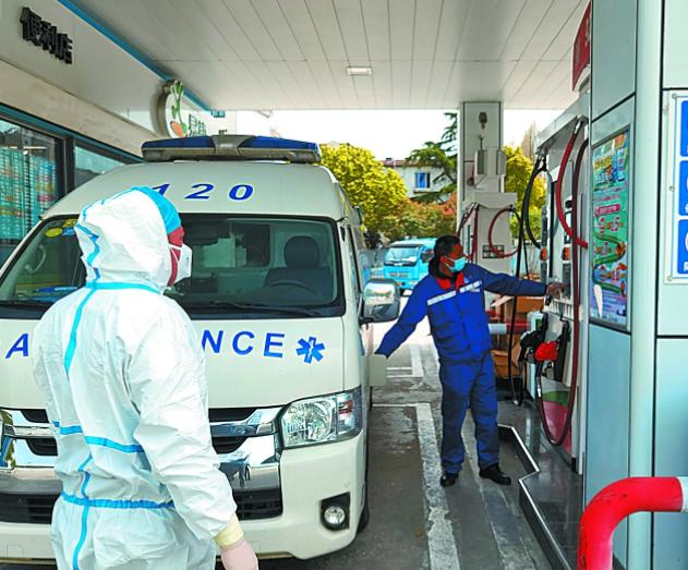 3月28日,上海石油北蔡加油站员工为抗疫救护车辆加油。