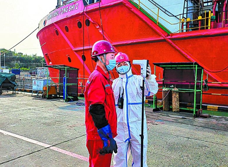 3月29日,浙江舟山的上海海洋局海工船员工为转运的海上平台人员测温消毒。