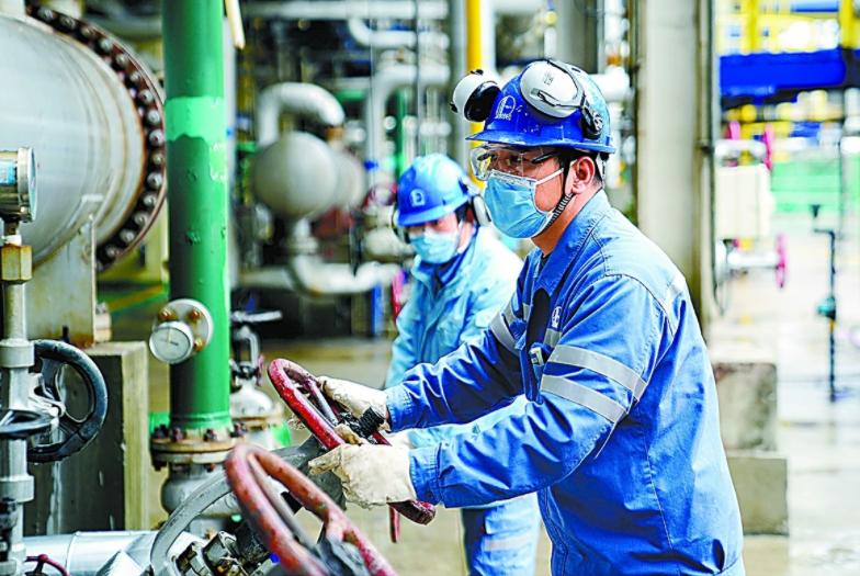 3月25日,上海石化炼油部5号炼油联合装置员工在现场作业。
