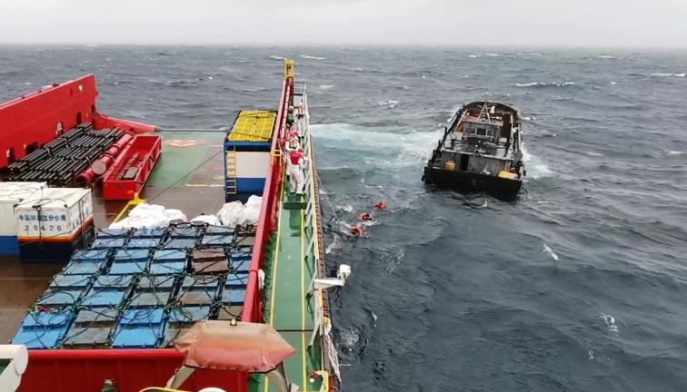 上午十一点三十五分,经过沟通,勘探211将救援绳索抛至遇险船,遇险船员将救援绳固定在救生圈上并戴上救生圈后入水,营救人员将遇险船员拉至攀爬网,遇险船员攀爬上船。“真是不敢想象,太感谢你们了。”最后一名上来的船员激动地说道。