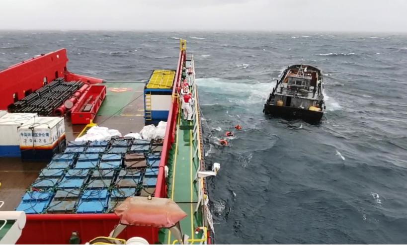 上午十一点三十五分,经过沟通,勘探211将救援绳索抛至遇险船,遇险船员将救援绳固定在救生圈上并戴上救生圈后入水,营救人员将遇险船员拉至攀爬网,遇险船员攀爬上船。“真是不敢想象,太感谢你们了。”最后一名上来的船员激动地说道。
