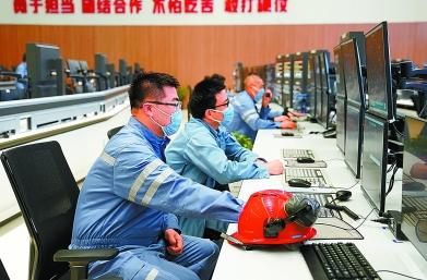 图1:上海石化烯烃部成立多个特护小组,保障低负荷下装置运行稳定。图为5月18日,烯烃部员工在中控室查看生产情况。