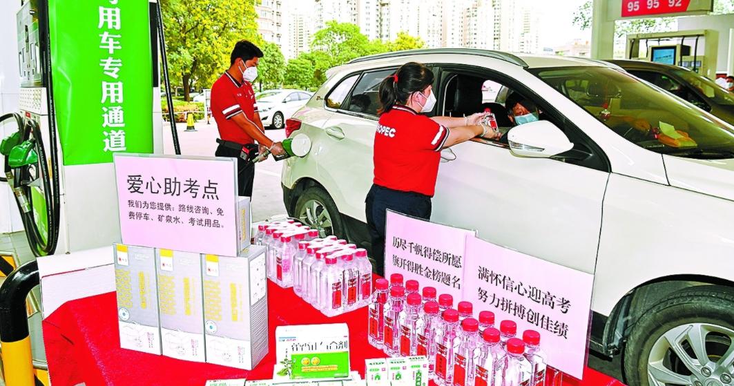 6月7日,全国高考开考,北京地区有4.8万名考生参加考试。北京石油在考场周边加油站设置专用通道,搭建爱心助考点,免费提供饮用水、口罩、消毒湿巾等物品,为考生和家长营造舒心的候考环境。图为望京新城加油站员工为准备接送考生的车辆加油。