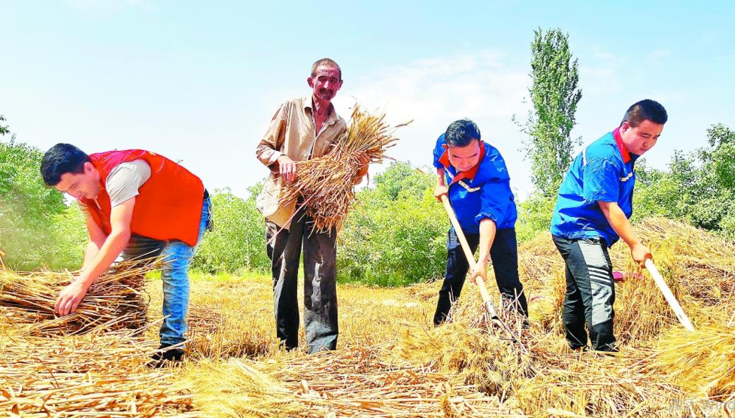 近日,新疆石油驻和田地区洛浦县的10个“访惠聚”工作队采取机械、人工相结合的方式帮助当地有困难的农户抢收小麦,截至6月15日,帮助收割小麦300亩。自新疆石油“访惠聚”工作队成立以来,已连续9年助力夏收,用实际行动践行民族团结一家亲。图为“访惠聚”工作队员帮农户收麦。