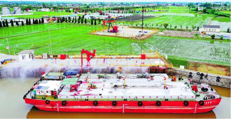 近日,华东石油局联合江苏省公安厅内保总队在泰州采油厂洲城班站开展公共安全(反恐防范)、消防暨水体污染应急预案演练。华东石油局首次以“无死角”采录方式进行直播,现场观摩人员通过LED大屏观看演练全过程。图为演练中,水体污染处置环节对放油码头进行喷淋降温。记者沈志军摄耿捷钱忠葆文