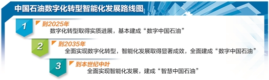 ——明确数字化转型、智能化发展路线图。到2025年,数字化转型取得实质进展,基本建成“数字中国石油”。到2035年,全面实现数字化转型,智能化发展取得显著成效,全面建成“数字中国石油”。到本世纪中叶,全面实现智能化发展,建成“智慧中国石油”。合理清晰的规划助力中国石油走好以智能化为特征的数字化转型新征程。