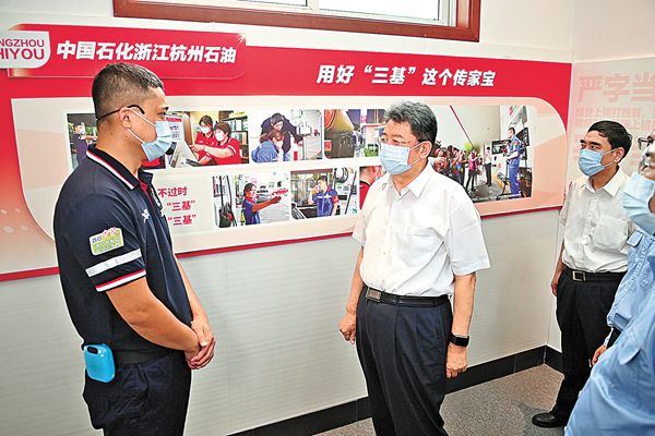 8月31日,马永生在浙江杭州石油秋涛路加油站了解“三基”工作开展情况。记者 章铮万里舒志国摄影报道